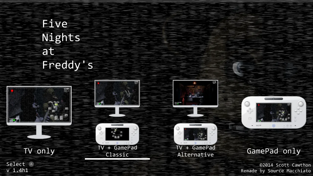 FNaF: Wii U Edition is a remake of Five Nights at Freddy's for Wii U made by Source Macchiato. You have been recruited as a night guard at Freddy Fazbear's Pizza restaurant and must monitor animatronics while avoiding getting killed. Select the camera on your gamepad and watch on your TV screen if anything strange happened. This remake includes translation into Arabic, Catalan, French, German, Italian, Slovak, Spanish and Turkish languages and different layouts.