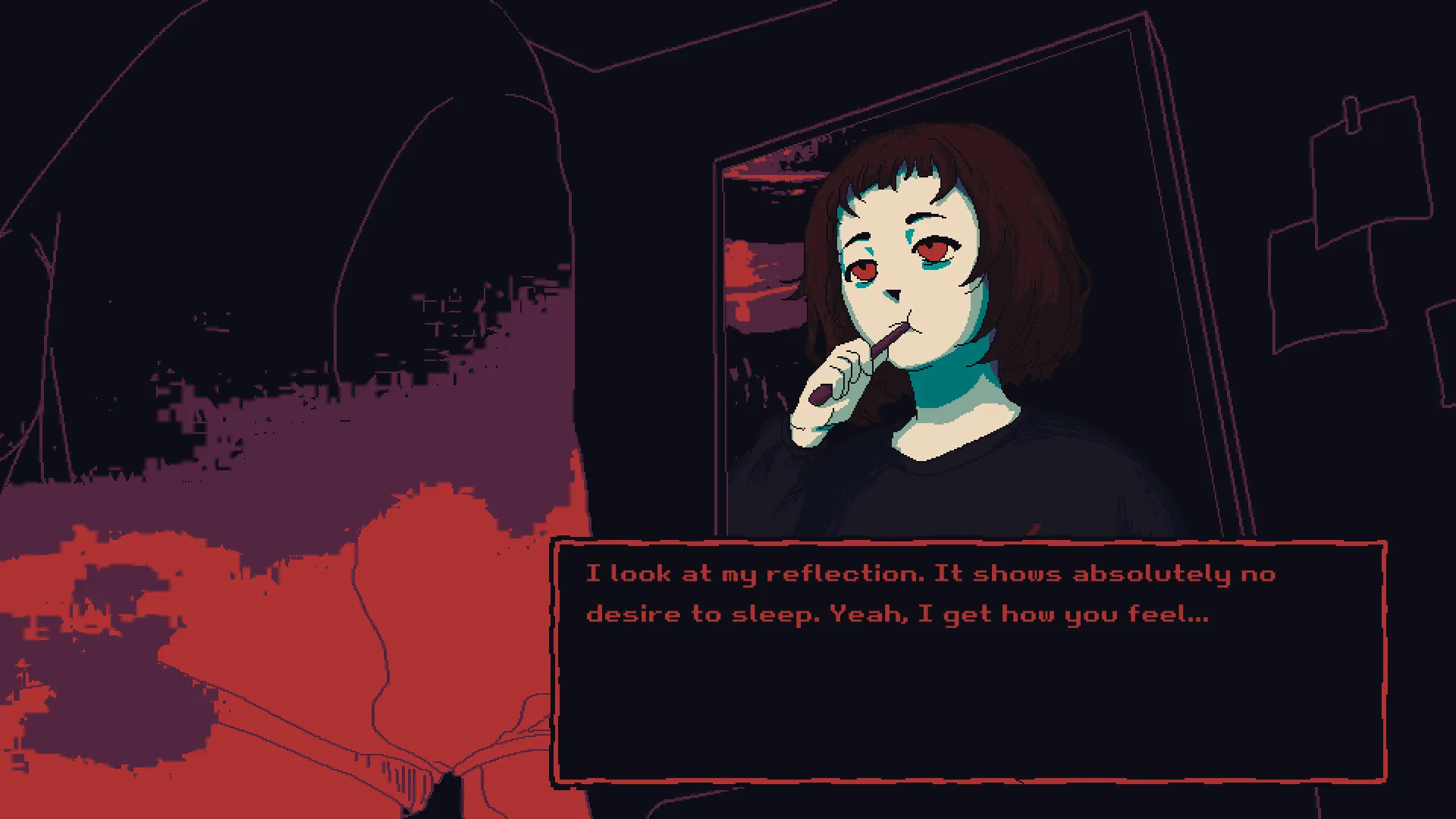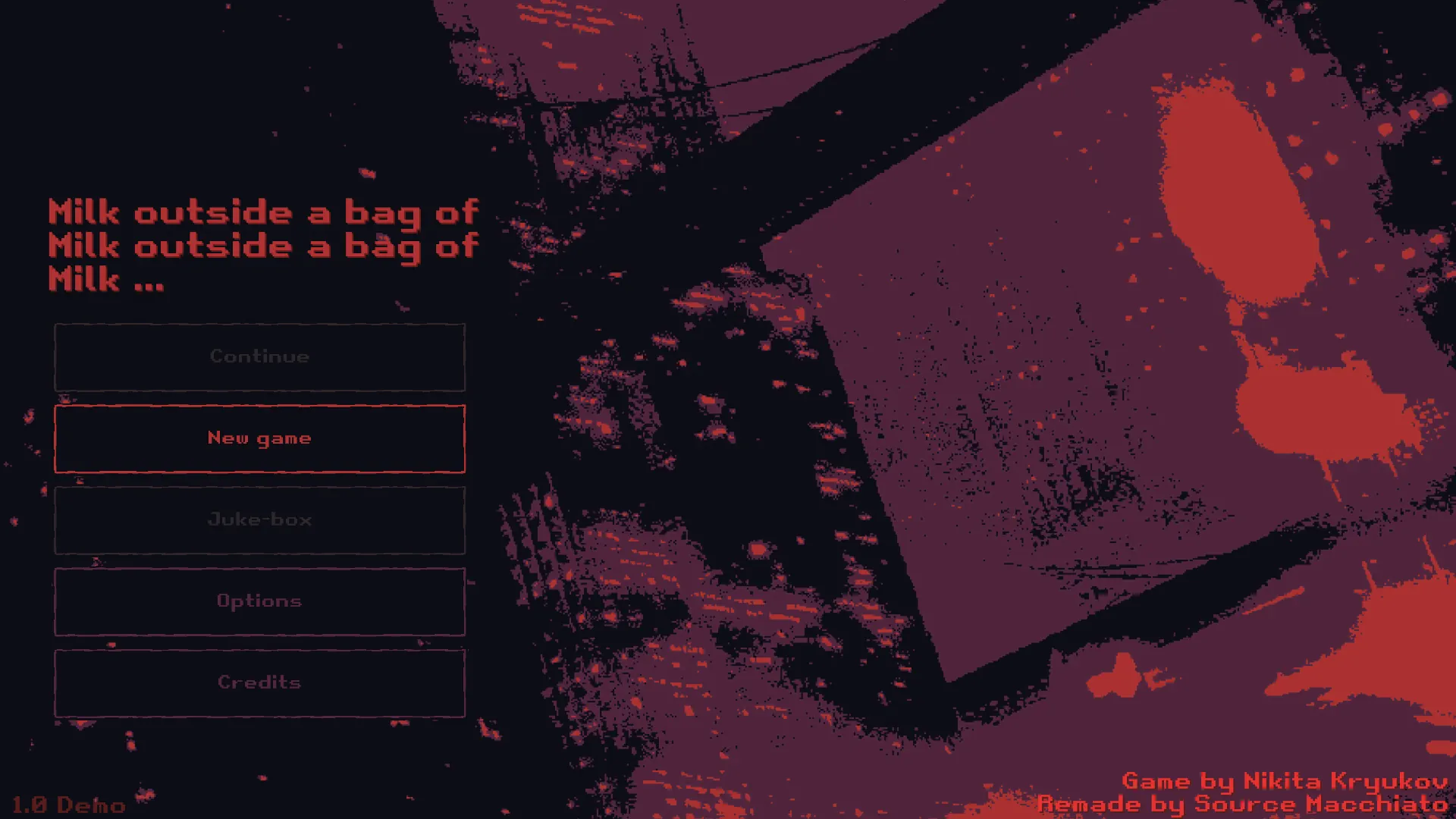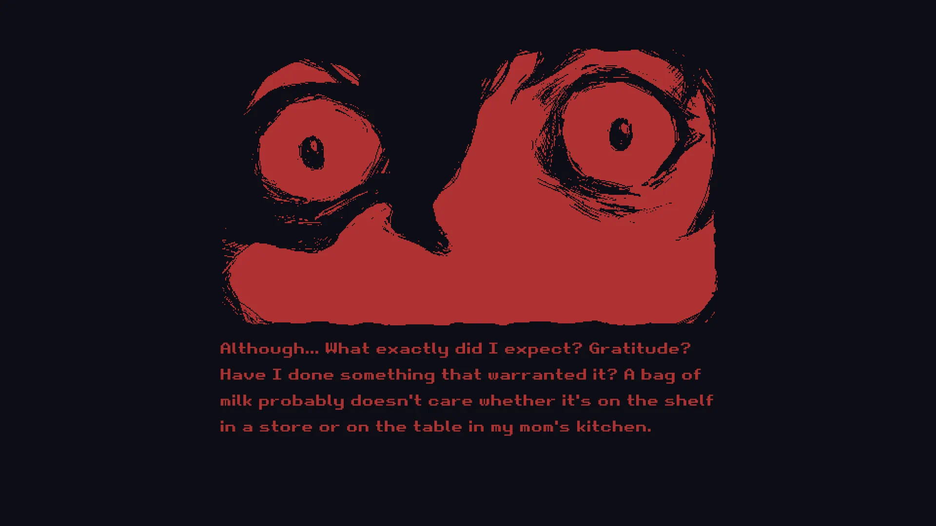 Milk Outside a Bag of Milk Outside a Bag of Milk is a short story of a mentally ill girl as she struggles with her thoughts and reality. The player takes on the role of an internal voice, accompanying the girl as she attempts to process her trauma and daily life. The story is grimly abstract, dreamlike, and unsettling.